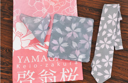 啓翁桜をモチーフにしたネクタイやスカーフ、ポケットチーフは西川町オリジナル。