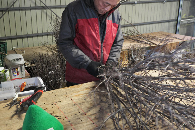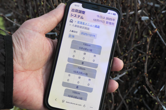 年内の出荷を目指して、10月の下旬から花芽を付けた枝の切り出しが始まり、作業室で150cm・120cmなどのサイズに分けて切り揃えるペロ。啓翁桜は秋になって気温が下がると休眠して、8℃以下の気温で500時間以上過ごすと開花できる状態に。その低温遭遇時間が過ぎてから促成温室に移すんだって。
