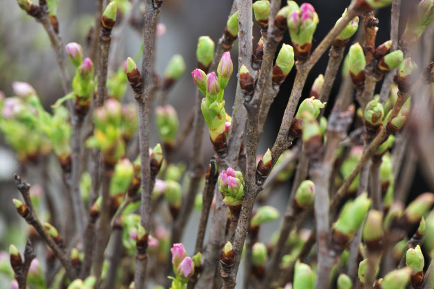 眠りから覚めた啓翁桜は「春が来た!」と勘違いして、促成温室の中でだんだん蕾を膨らませていくペロ。品質の高い啓翁桜を、需要の高い時期に出荷するには温度管理が重要で、20日間くらい促成温室に置いて仕上げるそう。蕾のピンク色がちょっと見えた頃が、出荷のサイン。