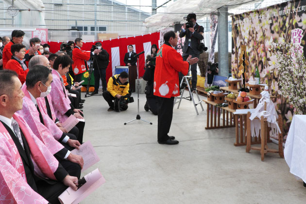 西川町吉川の促成・集出荷施設で、町やJAの職員など約30人の関係者が出席して行われた啓翁桜の出発式。厳かに神事が執り行われ、神主の祝詞奏上に続いてJAさがえ西村山・安孫子常哉組合長が玉串を捧げ、品質のいい啓翁桜を安全に出荷できるよう祈願したペロ。