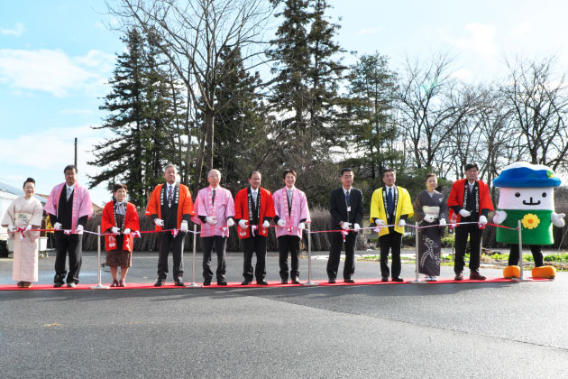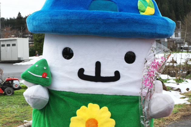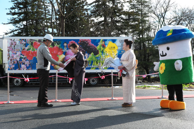 首都圏の市場に向かうトラックの運転手さんに、送り状と花束を贈り、テープカットを行ったペロ。右にいるのは、西川町月山朝日観光協会のイメージキャラクター「ガッさん」。西川町は月山の麓に広がる町で、「ガッさん」は自然豊かな月山に棲む妖精ペロ。