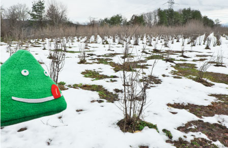 山形県のほぼ中央にある西川町。冬は豪雪地帯で農業ができないため、最初4人の農家さんが冬場に出荷できる農産物として、荒廃したぶどう団地で啓翁桜の栽培を始めたそう。西川町の冷涼な気候が栽培に適していて収益性も高いこと、農家の高齢化などで農地の荒廃が進んでいたことから、町全体として荒廃農地を再生して団地化に取り組むことを決めたペロ。