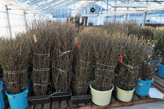 眠りから覚めた啓翁桜は「春が来た!」と勘違いして、促成温室の中でだんだん蕾を膨らませていくペロ。品質の高い啓翁桜を、需要の高い時期に出荷するには温度管理が重要で、20日間くらい促成温室に置いて仕上げるそう。蕾のピンク色がちょっと見えた頃が、出荷のサイン。