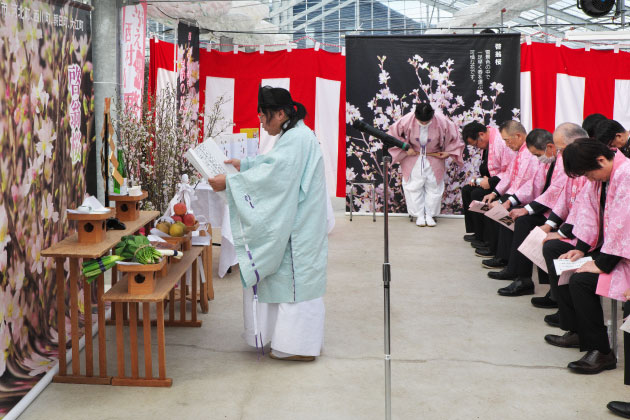 西川町吉川の促成・集出荷施設で、町やJAの職員など約30人の関係者が出席して行われた啓翁桜の出発式。厳かに神事が執り行われ、神主の祝詞奏上に続いてJAさがえ西村山・安孫子常哉組合長が玉串を捧げ、品質のいい啓翁桜を安全に出荷できるよう祈願したペロ。